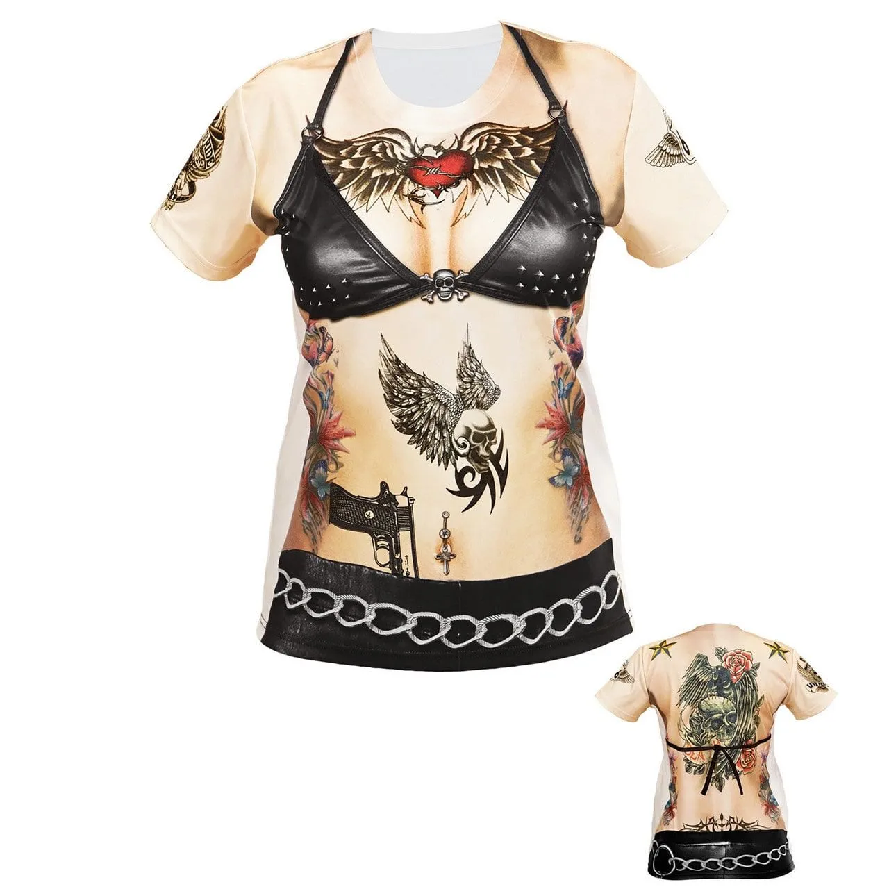 Jij ziet er er wel echt uit als een superstoere chick in dit tattoo shirt met geprinte zwarte bikini. Door dit shirt met korte mouwen lijkt het alsof je onder de tatoeages zit. De buik, borst, armen en rug zijn versierd met bad ass plaatjes van doodskoppen, een pistool en tribalachtige special effects. Perfecte kleding voor de flinke truckersvrouw die samen met haar stoere trucker naar het Zwarte Cross festival gaat.
